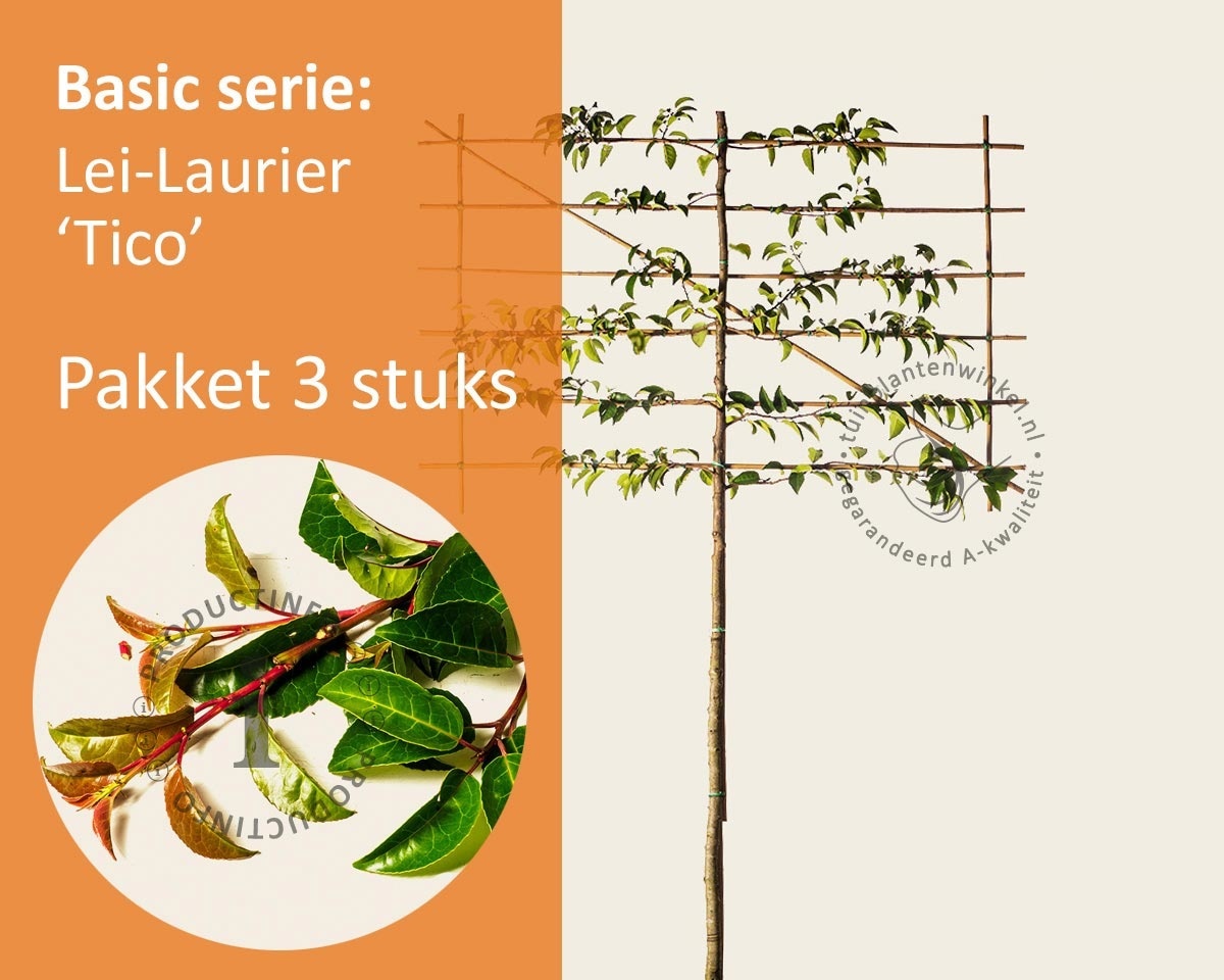 Lei-Laurier lusitanica ssp azorica 'Tico' is een variëteit van de Portugese laurier, deze is goed winterhard. Vandaar dat we deze soort gekozen hebben om te gebruiken als leiboom. jonge scheuten krijgen bij het uitlopen mooie bronskleurige bladeren, die in de zomer heldergroen worden. Met de Lei-Laurier 'Tico' creëert u een groenblijvend scherm in de tuin voor extra privacy of ter camouflage van een muur of bijvoorbeeld schutting.