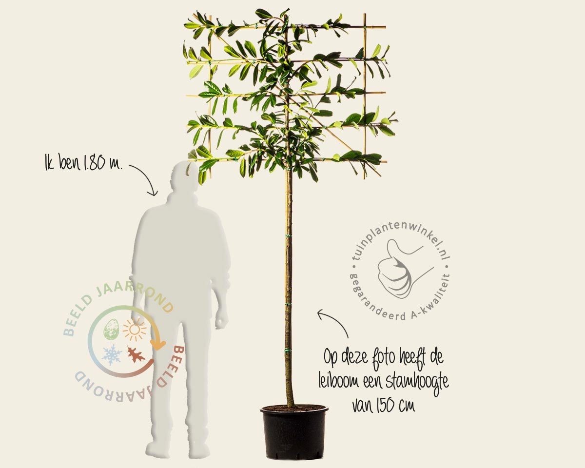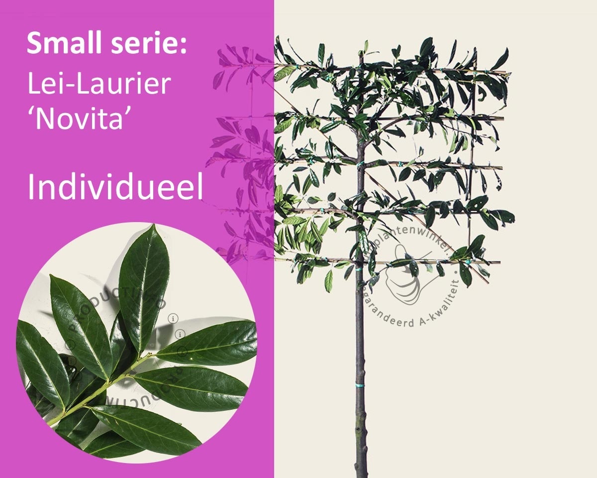 De Lei-laurier 'Novita' is een groenblijvende leiboom; deze variant in de small-serie heeft een wat lagere stamhoogte. In het voorjaar bloeit Prunus laurocerasus 'Novita' met witte, kaarsachtige bloemen. Het hele jaar door verkrijg je met deze leiboom een dicht scherm. Plaats de leiboom op een wat beschuttere plaats in de tuin. Vooral op winderige plaatsen in het buitengebied kan de boom schade oplopen in de winter. Op een beschutte plaats in de tuin doet de leiboom het prima! Een andere alternatief voor een groene leiboom uit de small-serie is de Lei-Portugese Laurier of de Lei-Conifeer.