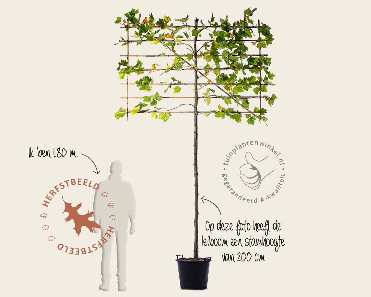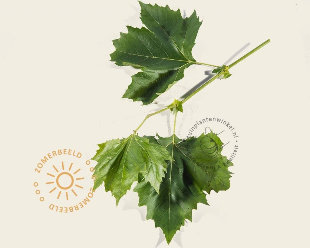 Lei-Platanus hispanica is samen met de Lei-Linde een klassieker onder de leibomen. Met zijn geweldige groeikracht en grote bladeren is er snel veel privacy geschapen in uw tuin. Door zijn gevlekte stam en knotten heeft de Leiplataan een mediterraan karakter, hierdoor kunt u uw tuin voorzien van een speciaal sfeertje. In vergelijking tot veel andere leibomen vraagt Lei-Platanus hispanica iets meer ruimte, zodat de takken in de zomer kunnen uitgroeien. Wij van Tuinplantenwinkel.nl adviseren om mensen die astmatisch zijn of last hebben van hooikoorts, geen Lei-Platanen te planten. Platanen hebben een allergene beharing onder het blad, die kan irriteren op de luchtwegen. Neem in dat geval de leivorm van de Amberboom (of Liquidambar), die heeft daar geen last van.