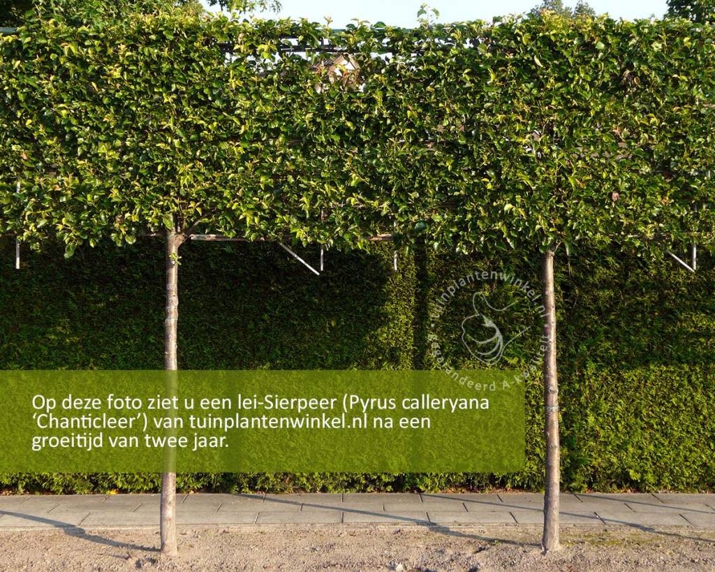 Lei-Pyrus calleryana 'Chanticleer' heeft gezond en glanzend groen blad. Hij wortelt goed diep en groeit op alle grondsoorten, ook aan de kust. Lei-Sierperen hebben ook de mooie, karakteristieke perenbloesem in april. Deze sierpeer geeft geen vruchten. De Lei-Peer is een prima leiboom als u een wat gefilterd beeld wilt krijgen. Voor het tegengaan van inkijk is deze leiboom minder geschikt. De herfstkleur is mooi geel met rood. Daarnaast blijft het blad tot in de late herfst aan de boom hangen. De Lei-Sierpeer is een van de leibomen uit ons uitgebreide assortiment.