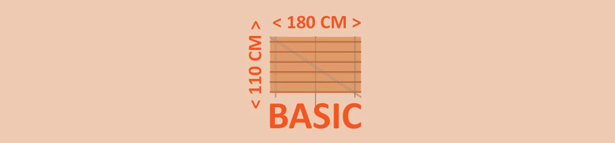 De rek- of schermgrootte van de Basic-leibomen bedraagt 180 x 110 cm (bxh). Het rek bestaat uit een zestal etages waarop de hoofdtakken of gesteltakken zijn aangebonden. De leibomen worden geleverd met vaste stamhoogtes. Dit is de hoogte gemeten van de voet van de boom tot aan de onderste etage van het rek. Omdat deze hoogte vastligt is het belangrijk vooraf te bepalen welke hoogte u nodig heeft. Als u bijvoorbeeld een schutting of muur heeft staan met een hoogte van 180 cm volstaat een stamhoogte van 180 of 190 cm. De schutting en leibomen zullen dan een geheel vormen.