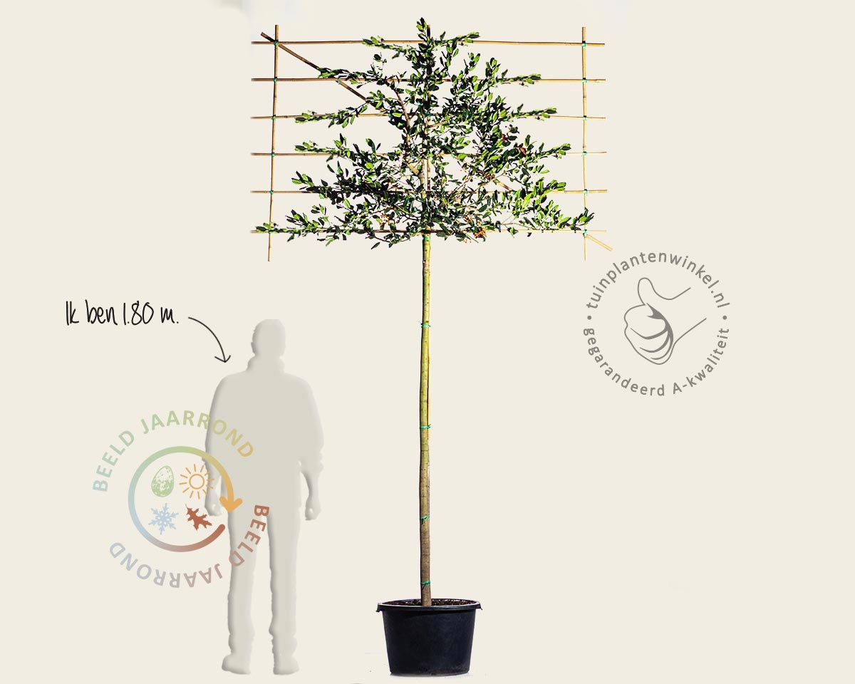 De Leihulst - Rek 180x110 cm is een echte blikvanger in de tuin dankzij zijn donkergroene, glanzende bladeren die het hele jaar door aan de boom blijven zitten. Deze groenblijvende leiboom heeft een dichte kroonstructuur, waardoor hij uitermate geschikt is voor het creëren van beschutting en privacy. In de herfst verschijnen er oranjerode bessen aan de boom, die niet alleen kleur geven aan de tuin, maar ook veel vogels aantrekken. Deze leiboom vormteen strak en uniform scherm, ideaal voor zowel de voortuin als de achtertuin. De Leihulst is goed winterhard en behoudt zijn fraaie uitstraling, zelfs tijdens de koudste maanden van het jaar. Zo geniet je het hele jaar door van een groene, levendige tuin.