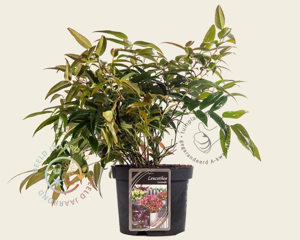 Druifheide is een ideale tuinplant voor gesloten vakbeplanting. Ook mooi als klein groepje in de border of in een pot op het terras en balkon. Leucothoe axillaris 'Carinella' is een groenblijvende tuinplant. Het blad verkleurt van groen naar donkerrood. Tijdens de bloei in mei-juni verschijnen witte, hangende bloemetjes, die mooi afsteken tegen het blad.