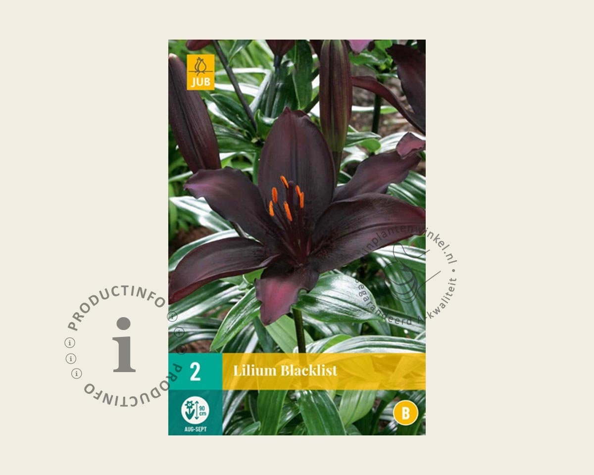 De Aziatische lelie 'Blacklist' heeft een behoorlijk afwijkende kleur voorbij de rest. De bloemen zijn donkerrood, bijna zwart van kleur. Normaal is de Lelie een plant met een breed kleurenspectrum, de meest bekende type lelie geurt wel heerlijk. De Aziaat lelies hebben opstaande bloemen.