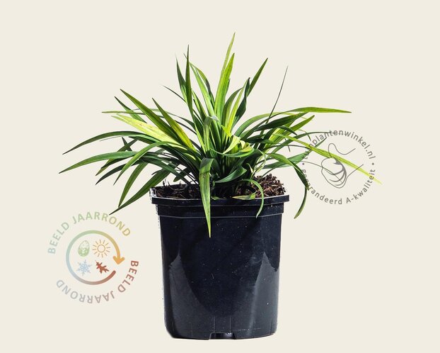 Antwoord: Van deze laagblijvende vaste plant, Liriope muscari 'Ingwersen', Leliegras is bij ons in 2 maten verkrijgbaar. De maat in een pot van 9 cm plant men het beste aan met 7 planten per vierkante meter. De planten in een pot C2 kunnen 5 planten per 2m aangeplant worden.