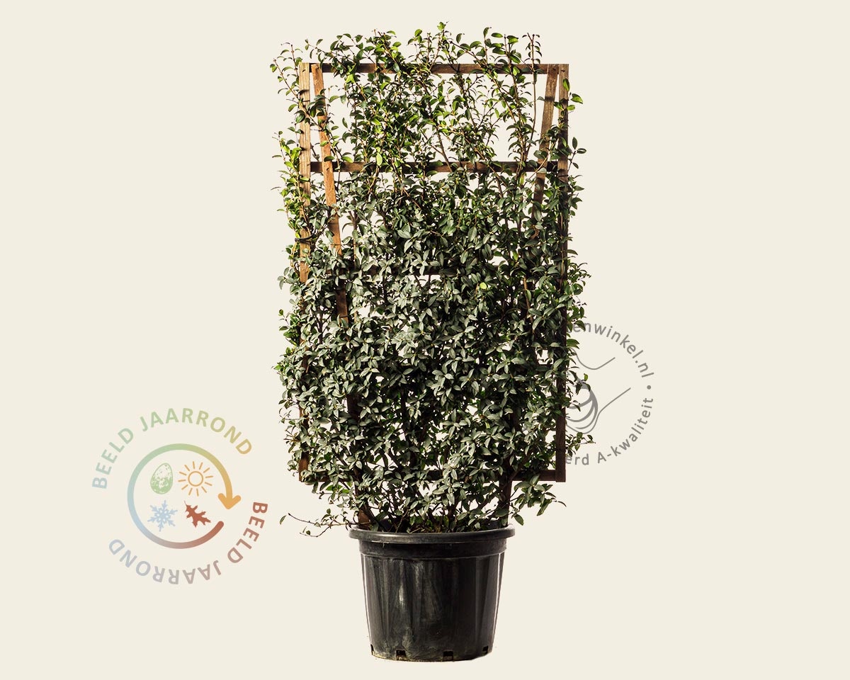 De Lonicera pileata is een wintergroene heester met groen tot donkergroen blad. Bij dit exemplaar is de struik aangebonden in een stevig houten frame. U haalt zo een kant-en-klaar haagelement in huis. U kunt de Lonicera in de tuin planten of in een ruime pot. Geef de tuinplant in de volle grond wat aanplantgrond bij het aanplanten. In een pot kunt u gewoon potgrond gebruiken. Ons advies zal altijd zijn om deze in de volle grond te planten in plaats van in een pot!