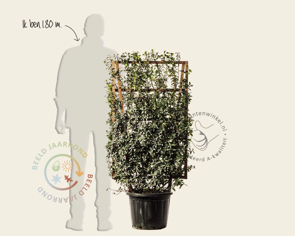 De tuinplant is aangebonden in een stevig houten frame. De hoogte van de totale plant is ongeveer 120 centimeter. De breedte is 70 centimeter.