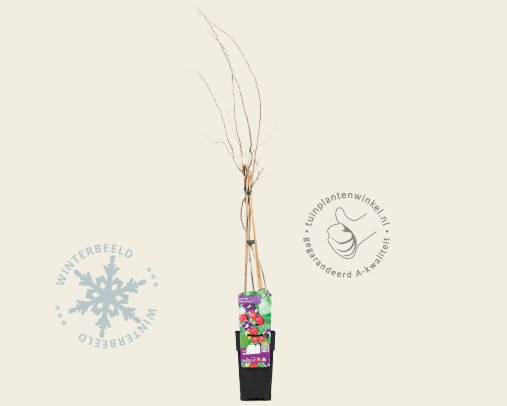 Deze struikachtige tuinplant heeft scherpe doorns. Daarom is Lycium barbarum ook geschikt om een ondoordringbare haag met een volwassen hoogte van wel 150-200 cm mee te vormen.
