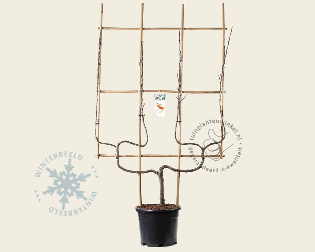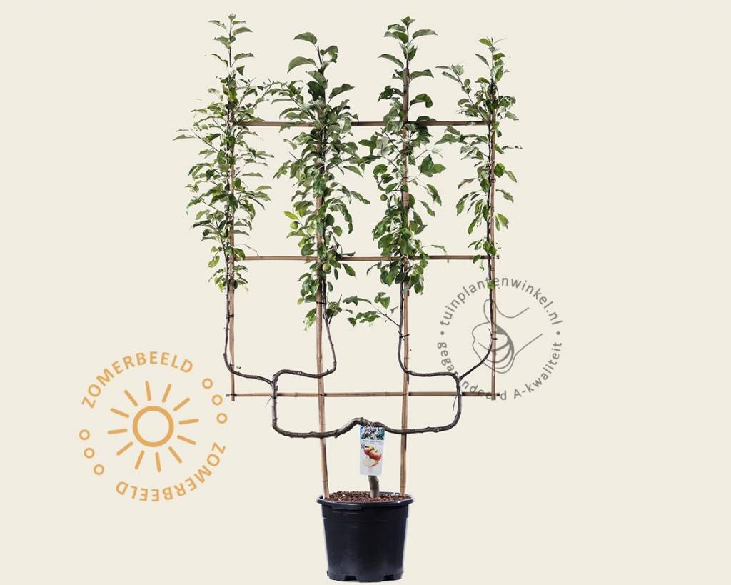 Wanneer er geen ruimte is voor een gewone fruitboom, kan een U-vorm gekweekte leifruitboom een goede oplossing zijn om toch te kunnen genieten van eigen gekweekt fruit! Een U-vorm heeft maar weinig ruimte nodig. De Handappel bloeit van april tot mei met rozewitte bloemen. Malus 'Elstar' is een zeer goede, zoete handappel en hij is zelf bestuivend. De tuinplant is vorstbestendig en verliest in de winter zijn bladeren.