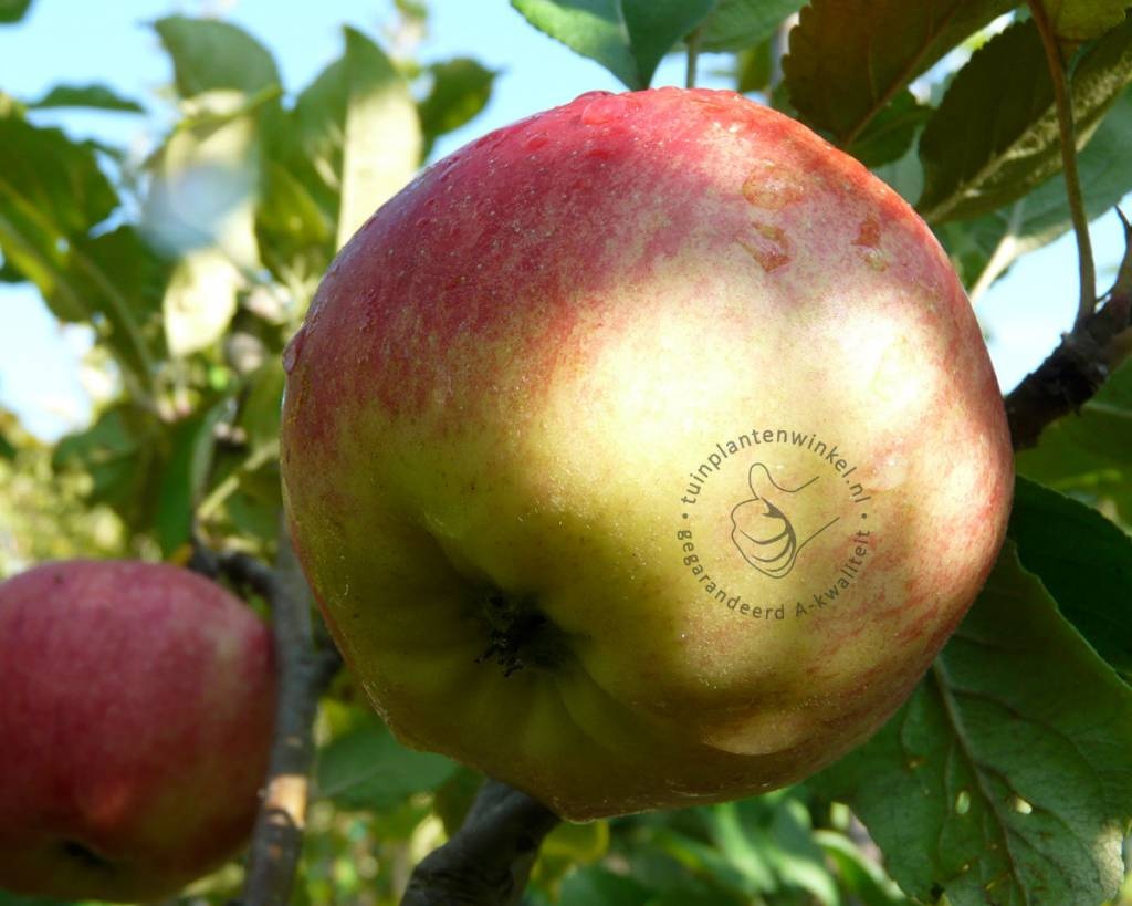 Ook deze hoogstam appelboom zal uiteindelijk uitgroeien tot een echte boom. Geef Handappel 'James Grieve' de ruimte die hij nodig heeft om zich te ontwikkelen. Al het fruit, dus ook de appel, rijpt het beste in de zon. Geef deze fruitboom daarom een zo zonnig mogelijk plekje in uw tuin. Malus domestica 'James Grieve' heeft een groen/gele vrucht met rode strepen. Het is een aromatische appel met een zachtzure smaak. Enig minpuntje aan de appel is het broze karakter. Eenmaal geplukt is voorzichtigheid geboden. Mede hierdoor is de appel uit supermarktassortiment verdwenen. We vinden de smaak echter te goed om hem links te laten liggen. James Grieve rijpt vaak al in augustus en is daarmee redelijk vroeg. James Grieve is ook een goede bestuiver voor andere appelrassen zoals de Cox orange, Ecolette, Elstar, Gala en Golden Delicious. Ook leuk om toe te passen in een fruit- of groentetuin. Een hoogstam fruitboom kan in het gazon of in een border geplant worden. Doordat de takken hoog beginnen kunt u onder de boom doorlopen maar heeft u wel een ladder nodig om het fruit te plukken.