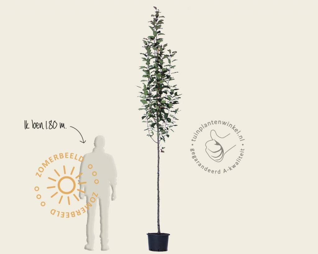 De boom verdraagt goed snoeien. Daardoor is deze boom goed in model te houden en kan hij door zijn smalle groeiwijze ook in een kleine tuin geplaatst worden. De uiteindelijke hoogte is 5 tot 10 meter, maar door te snoei en kunt u deze boom ook lager houden. De bladeren lopen rood uit en verkleuren later in de zomer gewoon groen. In het vroege voorjaar kunt u dode en kruisende takken het beste terug snoeien.
