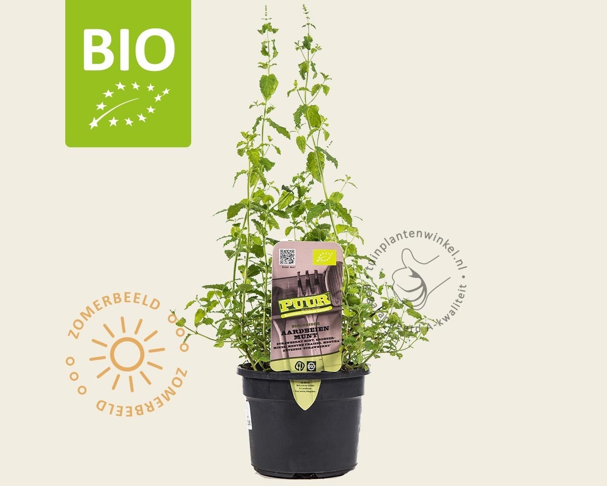 Mentha arvensis 'Strawberry' Puur is een bladverliezende kruidenplant. Deze Aardbeienmunt bloeit van juni t/m september met lichtpaarse bloemen, wordt uiteindelijk ongeveer 50 cm hoog en staat bij voorkeur in de zon - halfschaduw.