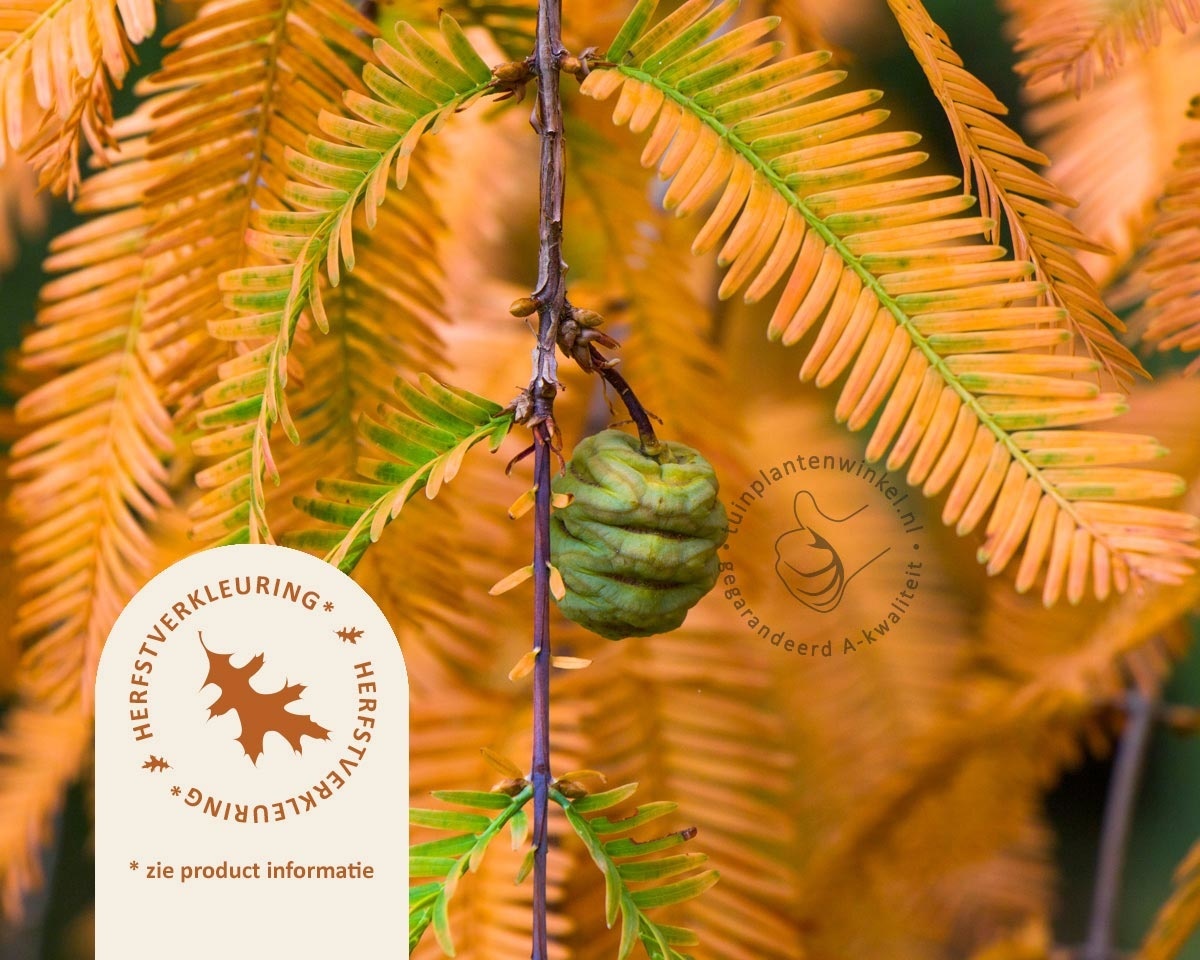 Het blad van Metasequoia glyptostroboides verkleurt in het najaar. De kleuren op de foto geven een indicatie van deze verkleuring. De exacte verkleuring is afhankelijk van de standplaats en het weer en kan per jaar verschillen. Het is dus niet zeker of u de verkleuring zoals deze gefotografeerd is, ook terugziet in uw tuin. Aan de kleuren die op deze foto zichtbaar zijn, kunnen geen rechten worden ontleend.