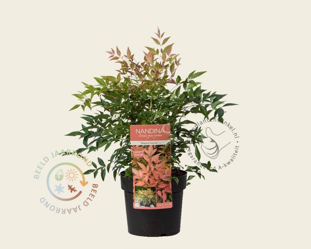 Nandina domestica 'Magical Sunrise' is een laagblijvende variant van de Nandina. De bladeren verkleuren naar warme, zalmoranje tinten in de herfst en winter. Bloeien doet deze cultivar nauwelijks; het is vooral de prachtige bladverkleuring, die ervoor zorgt dat deze tuinplant een waar sieraad is voor uw border. Schijnbamboe of Hemelse bamboe zijn de Nederlandse benamingen voor deze heester. De plant is niet eens nauw verwant aan bamboe maar wat betreft uiterlijk heeft ze er wel wat van weg. Laat u dus niet op het verkeerde been zetten.