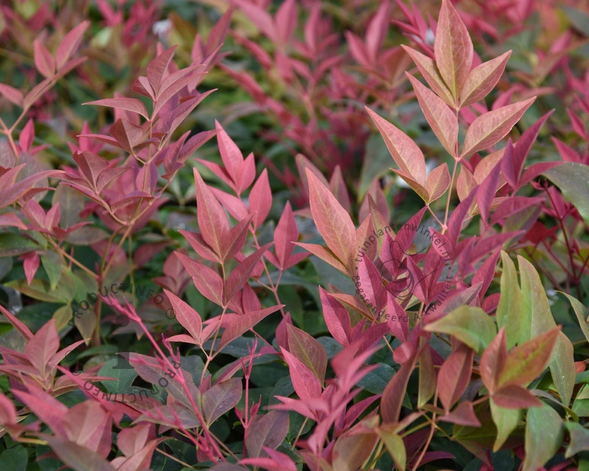Schijnbamboe of Hemelse bamboe zijn de Nederlandse benamingen voor deze heester. Deze tuinplant is niet eens nauw verwant aan bamboe, maar wat betreft uiterlijk heeft ze er wel wat van weg. Het blad van Nandina domestica 'Obsessed' loopt in het voorjaar lichtrood uit, daarna worden de bladeren groen in de zomer. In de herfst en winter kleurt het blad weer rood. Omdat deze plant wintergroen is, kunt u de gehele winter genieten van de bladkleuren. In het voorjaar vormt zich weer nieuw blad.