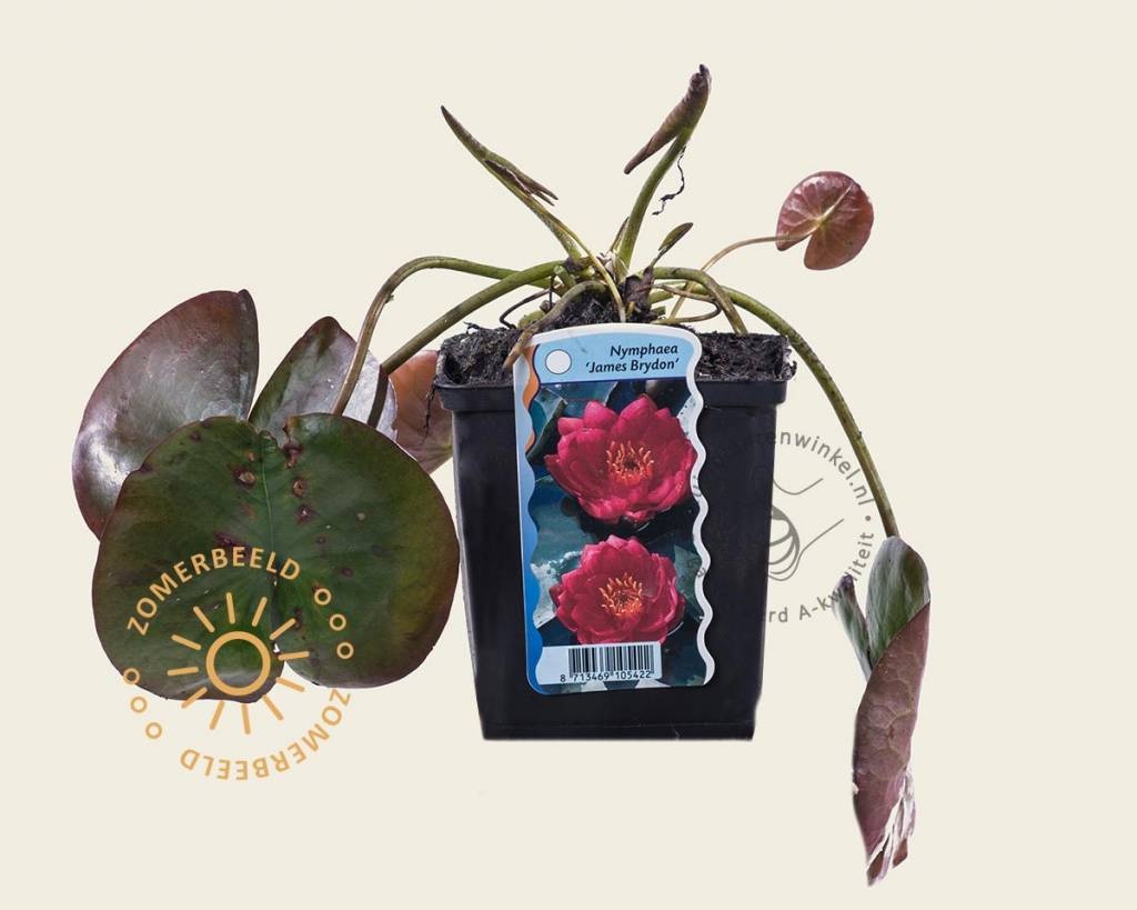 Nymphaea 'James Brydon' is een bladverliezende waterplant. Deze Waterlelie bloeit van juli t/m september met rode bloemen, wordt uiteindelijk ongeveer 20 cm hoog en staat bij voorkeur in de zon. De plantdiepte voor deze waterplant in de vijver bedraagt -40 tot -90 centimeter t.o.v. de waterspiegel.