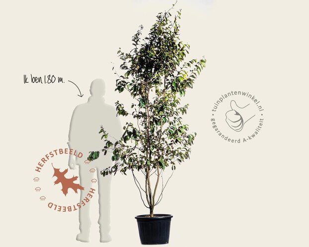 De Parrotia persica meerstammig, ook wel bekend als Perzisch ijzerhout, is een prachtige meerstammige boom die direct opvalt door zijn karakteristieke, wild gevormde struikvorm. Vanuit meerdere hoofdtakken groeit deze boom uit tot een middelgrote boom met een halfopen kroon, waardoor hij een natuurlijke, grillige uitstraling krijgt. Met een uiteindelijke hoogte van 7 tot 10 meter is de Parrotia persica meerstammig uitstekend geschikt voor kleine tuinen, maar ook in grotere tuinen en parken komt deze boom prachtig tot zijn recht.