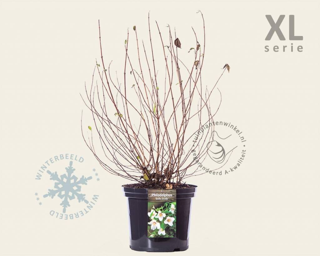 Philadelphus 'Belle Etoile' - XL is een heerlijk geurende Boerenjasmijn, die van mei tot juni bloeit met witte bloemen met wat roze en een paars hartje. Het is een bladverliezende tuinplant. Tuinplantenwinkel.nl levert de tuinplant in een hoogte van 60 tot 80 cm. Uiteindelijk is Philadelphus 'Belle Etoile' - XL met 200 cm volgroeid. Met de XL-maat haalt u meteen al een wat forsere struik in de tuin.