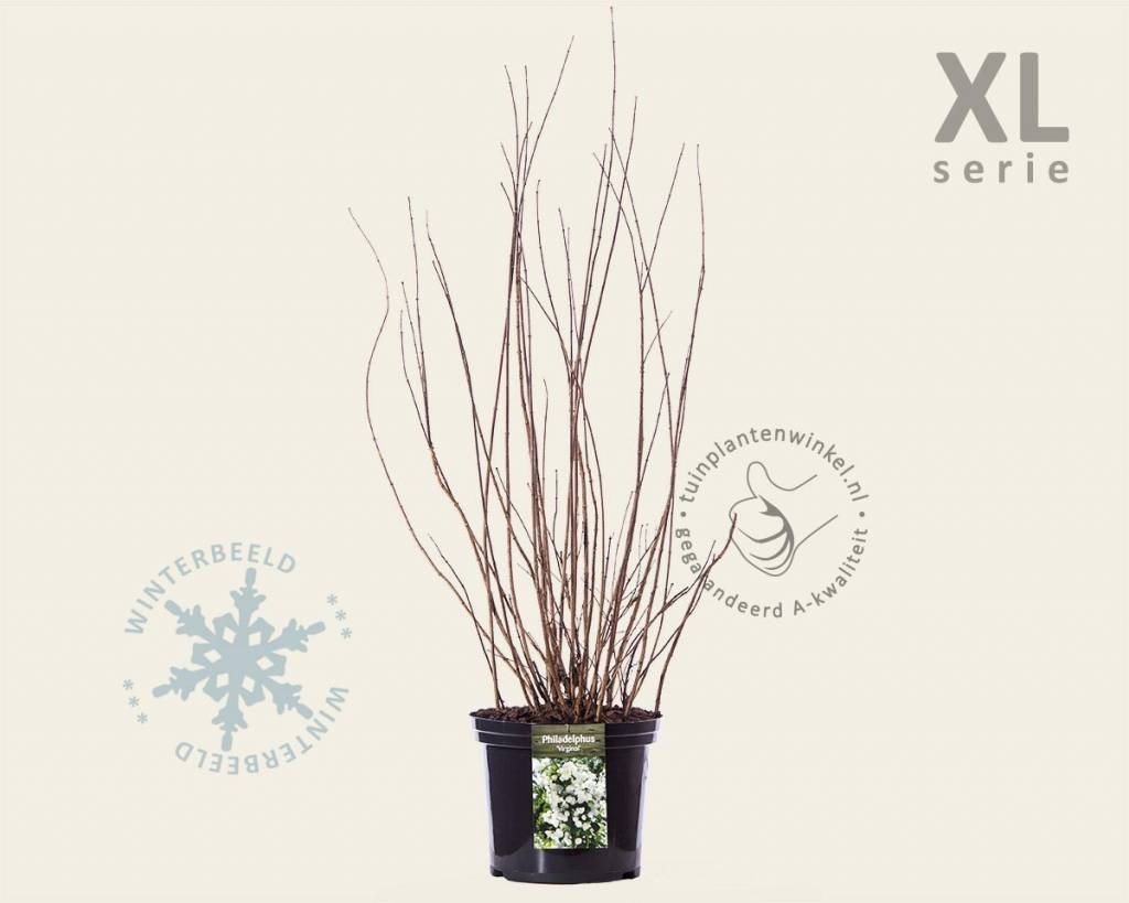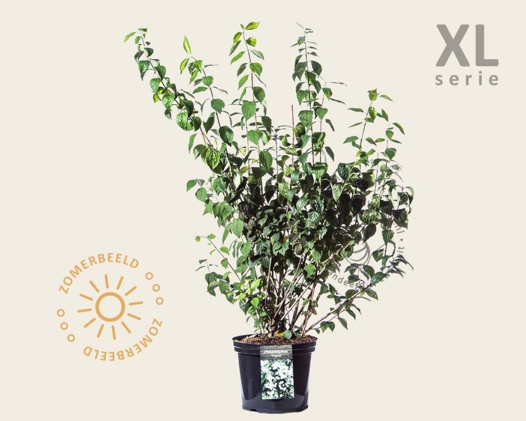 Philadelphus 'Virginal' - XL bloeit in mei-juni met sterk geurende, roomwitte bloemen, die bijen en vlinders aantrekken. Het worden al snel flinke struiken, die solitair of als haag in wat grotere tuinen toegepast kunnen worden. De Boerenjasmijn komt oorspronkelijk uit Azië en Noord-Amerika; de tuinplant is goed winterhard en verliest in de herfst zijn bladeren.