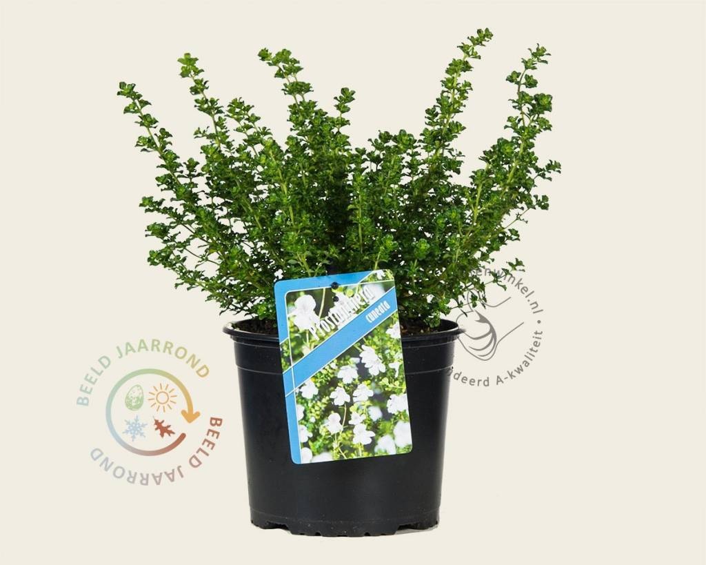 Dit compact groeiend struikje komt oorspronkelijk uit Australië en behoort tot dezelfde familie als lavendel. De kleine, donkergroene, ronde blaadjes geven een heerlijke muntgeur af. Muntstruik bloeit van augustus t/m september met een heleboel witte bloemen. Deze kleine bloempjes hebben een lilaroze hartje, oranje vlekjes en kleine paarse stippen waar bijen en vlinders graag op af komen. Dit wintergroene struikje kan prima in een pot geplant worden voor op het balkon of terras, liever niet in de volle grond van de tuin omdat het bij vorst naar binnen moet. Muntstruik, Prostanthera cuneata is te gebruiken als keukenkruid, b.v. om thee van te maken.