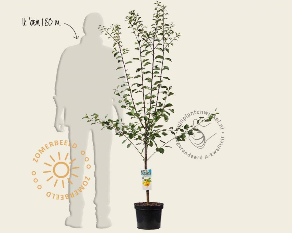 Ook deze laagstam pruimenboom zal uiteindelijk uitgroeien tot een echte boom. Geef Prunus domestica 'Mirabelle de Nancy' de ruimte die hij nodig heeft om zich te ontwikkelen. Pruim 'Mirabelle de Nancy' bloeit in april met witte bloemen, waaruit goudgele vruchten groeien, die vanaf half augustus geoogst kunnen worden. Deze tuinplant is ook leuk om toe te passen in een fruit- of groentetuin. De pruimenboom verliest in de herfst zijn bladeren en is vorstbestendig.
