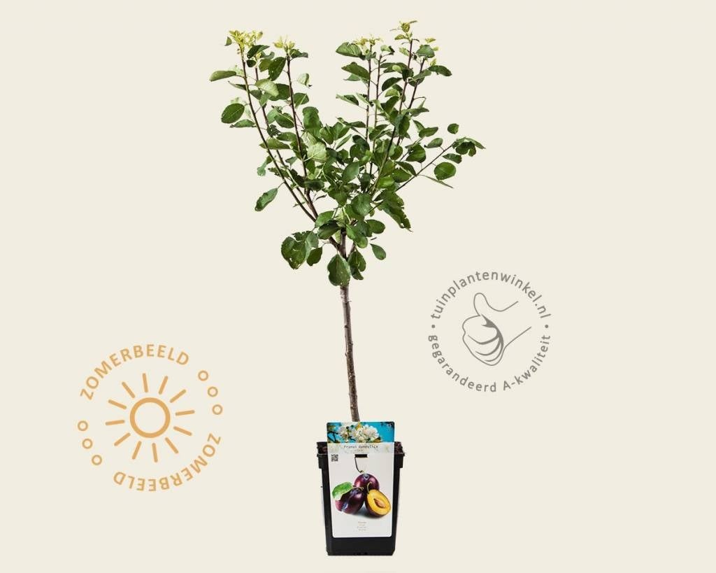 Deze mini variant van de pruimenboom (ook wel patio pruimenboom genoemd) is op een traaggroeiende onderstam geënt. Dit betekent dat Prunus domestica 'Opal' - mini fruitboom langzaam groeit, dus laag blijft, en tevens prima vruchten draagt! Mini fruit is daardoor prima geschikt op plekken waar niet zoveel ruimte is voor een grote fruitboom. Pruim 'Opal' kan in een bloembak uw terras of balkon opfleuren en jarenlang voorzien van de nodige vruchten! Prunus domestica 'Opal' - mini geeft geel/paarsrode vruchten. De pit zit los in de vrucht als deze rijp is. De smaak is zoet. De tuinplant is een goede zelfbestuiver.