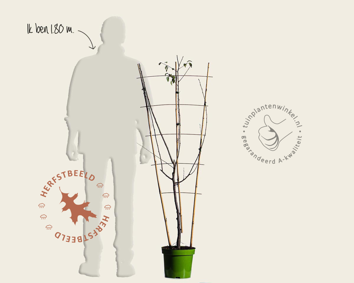 De Prunus domestica TRIO in rek is een ware blikvanger in de tuin en biedt een overvloed aan heerlijke pruimen, dankzij de combinatie van drie bijzondere rassen: de Prunus domestica 'Hauszwetsche', Prunus domestica 'Mirabelle en de Nancy' en Prunus 'Victoria'. Deze unieke samenstelling zorgt voor een rijke oogst van geel-groene, paarsrode en blauwe pruimen, elk met hun eigen zoete smaak en karakteristieke eigenschappen.