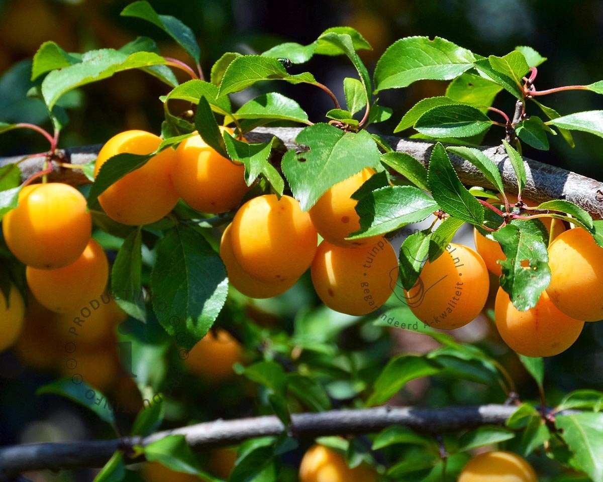 Prunus domestica TRIO ‘Hauszwetsche’, ‘Mirabelle de Nancy’ & ‘Victoria’ – in rek of Pruim
