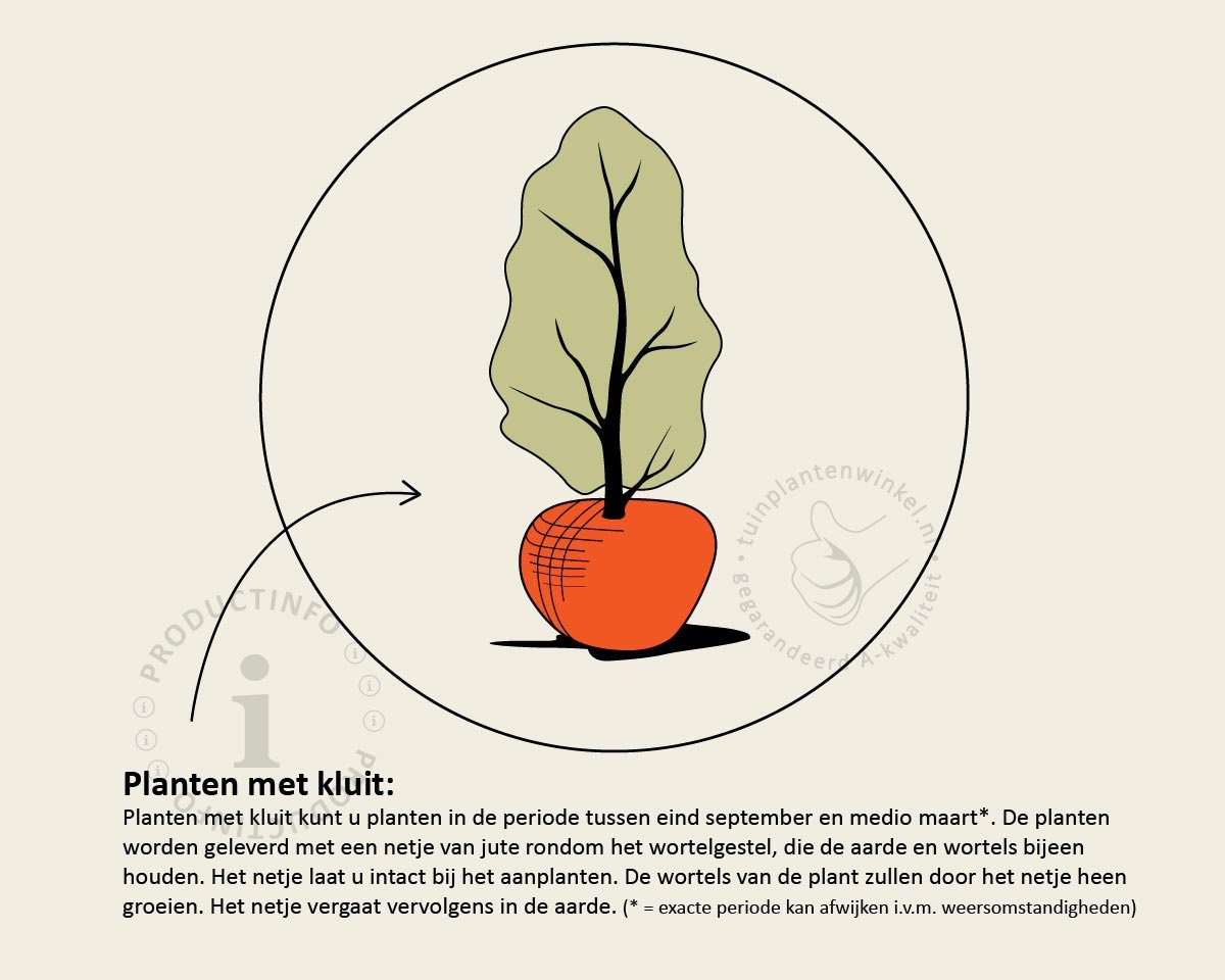 De kluit is NIET meegerekend bij de hoogtemaat van de plant. Het is de daadwerkelijke hoogte die boven de grond uitkomt!