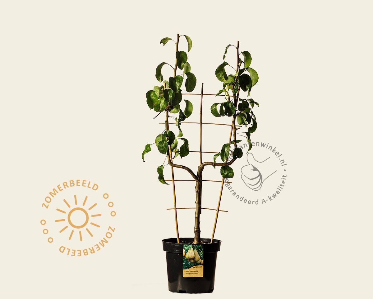 Wanneer er geen ruimte is voor een gewone fruitboom, kan een U vorm gekweekte leifruitboom een goede oplossing zijn om toch te kunnen genieten van eigen gekweekt fruit! Een U-vorm heeft maar weinig ruimte nodig. Deze peer bloeit van april - mei met witte bloemen en is een bladverliezende tuinplant. Pyrus 'Conference' is een goede, zoete handpeer.