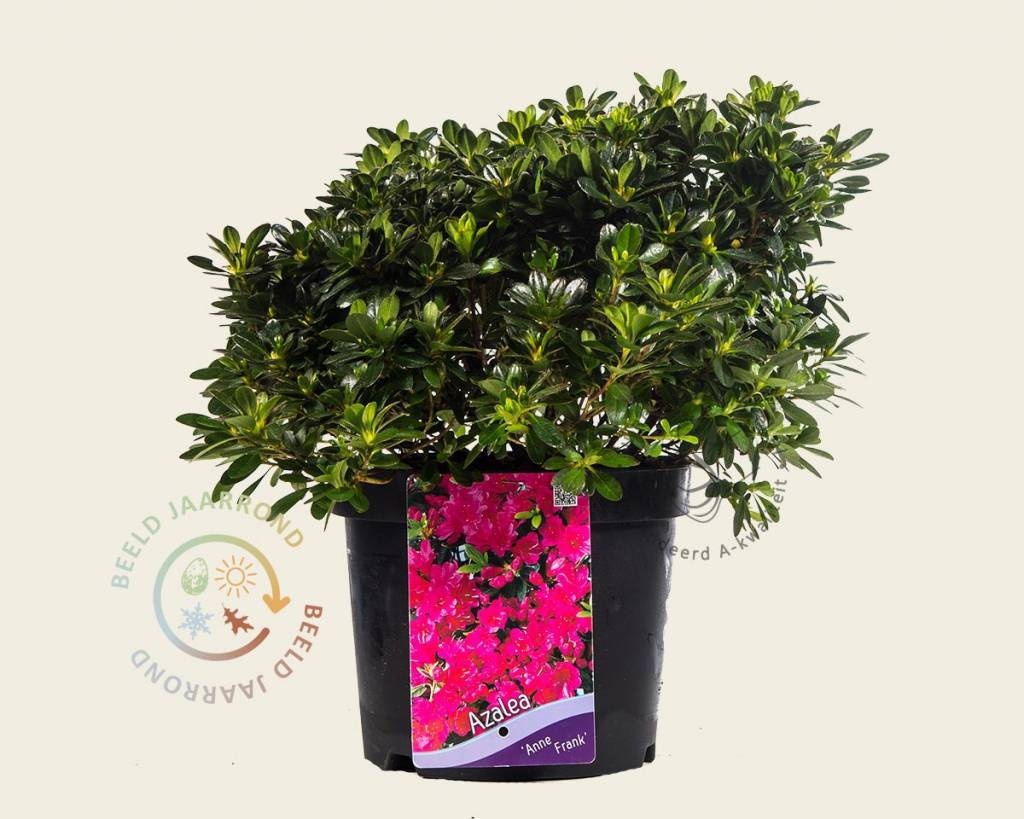 De Japanse azalea is directe familie van de Rhododendrons. Ze groeien langzaam en blijven compact en laag van vorm. Rhododendron Azalea 'Anne Frank' kan meer zon verdragen dan de 'gewone' Rhododendron. Tijdens de bloei krijgt deze soort roze bloemen. De tuinplant is vorstbestendig en behoudt in de winter zijn bladeren.