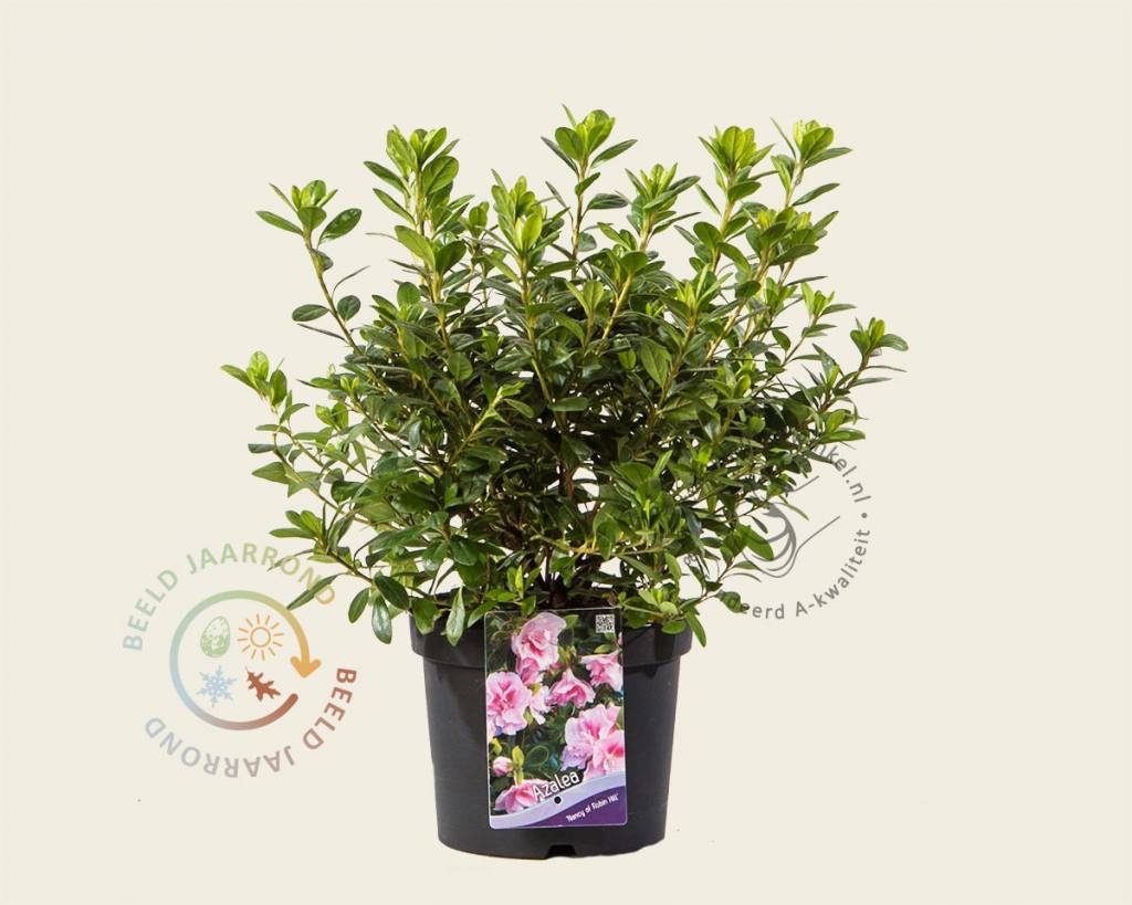 De Japanse Azalea is directe familie van de Rhododendrons. Ze groeien langzaam en blijven compact en laag van vorm. Rhododendron Azalea 'Nancy of Robin Hill' kan meer zon verdragen dan de 'gewone' Rhododendron. Hij krijgt in april - mei een overvloed aan lichtroze bloemen. De tuinplant is winterhard en verliest in de herfst zijn bladeren.