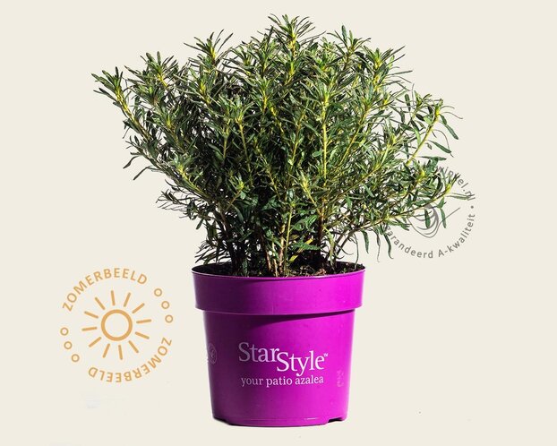 De Rhododendron Azalea 'StarStyle Lila' is een zeer aparte en vrije nieuwe Azalea soort. Deze compact groeiende Azalea heeft stervormige bloemen die zeer opvallend zijn. De lila tot paars gekleurende bloemen verschijnen in de maanden april mei en bloeit zeer rijk. De bladeren zijn klein, glanzend groen en smal van vorm. De Rhododendron Azalea 'StarStyle Lila' blijft best klein en zal een hoogte bereiken van ongeveer 50 cm. Doordat deze soort wat kleiner blijft is deze zeer geschikt voor in een pot op het terras of balkon.