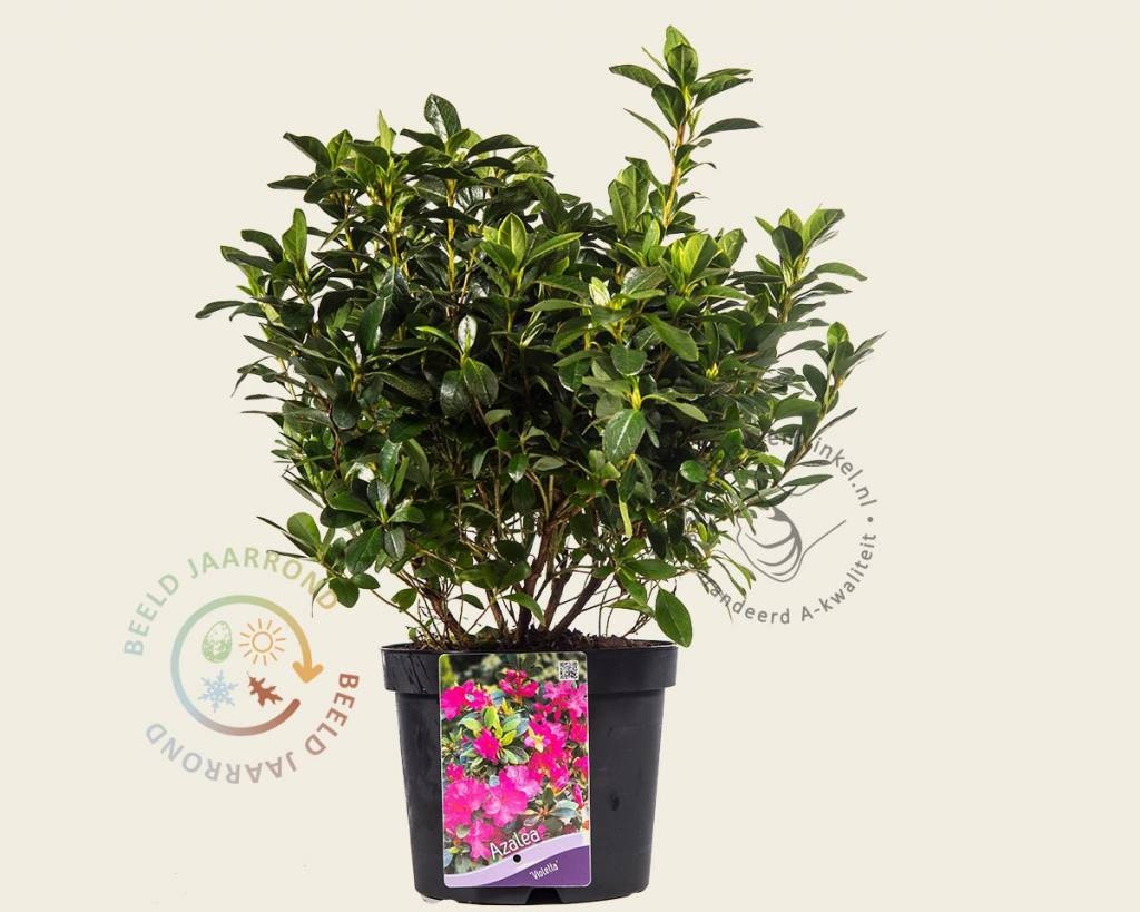 De Japanse azalea is directe familie van de Rhododendrons. De tuinplant groeit langzaam en blijft compact en laag van vorm. Rhododendron Azalea 'Violetta' kan meer zon verdragen dan de 'gewone' Rhododendrons en krijgt in april-mei paarse bloemen.