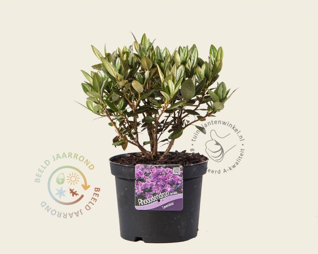Rhododendron 'Lavendula' is een dwergvariant. Deze soorten groeien langzaam en blijven compact en laag van vorm. Ze worden gemiddeld zo'n 50 cm hoog. Dwerg Rododendron wordt vanwege zijn opgaande groeiwijze iets hoger en krijgt in april - mei paarse bloemen. De tuinplant is vorstbestendig en behoudt in de winter zijn bladeren.