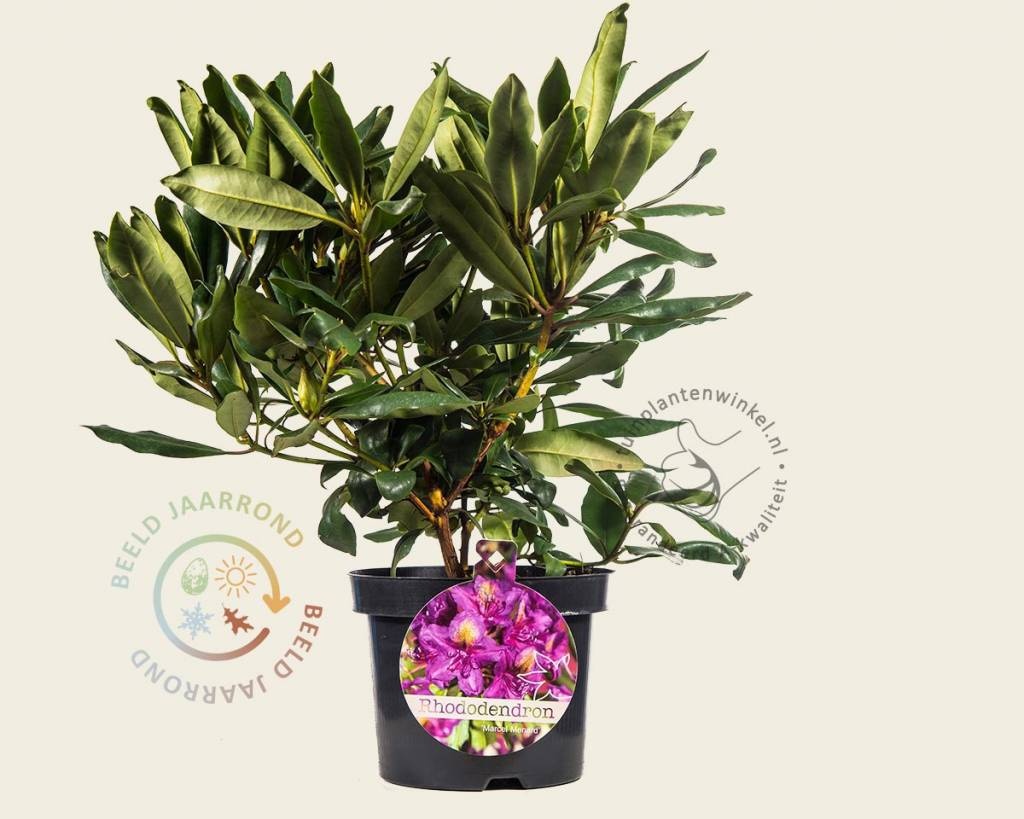 Standplaats Rhododendron 'Marcel Menard' met donkerpaarse bloemen