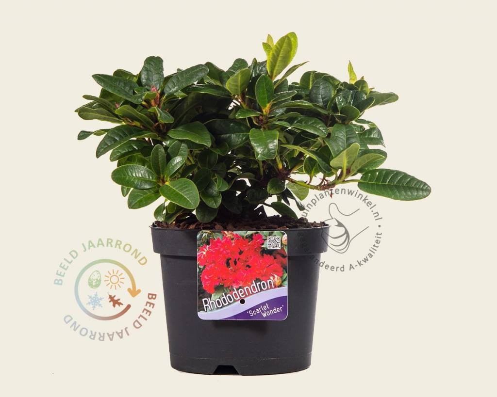 Rhododendron 'Scarlet Wonder' is een dwergvariant. Deze soorten groeien langzaam en blijven compact en laag van vorm. Het kleine blad van de Dwerg rododendron is glanzend groen en groeit aan wijnrode takken. Tijdens de bloeiperiode vormen zich bloemtrossen met bekervormige, rode bloemen.