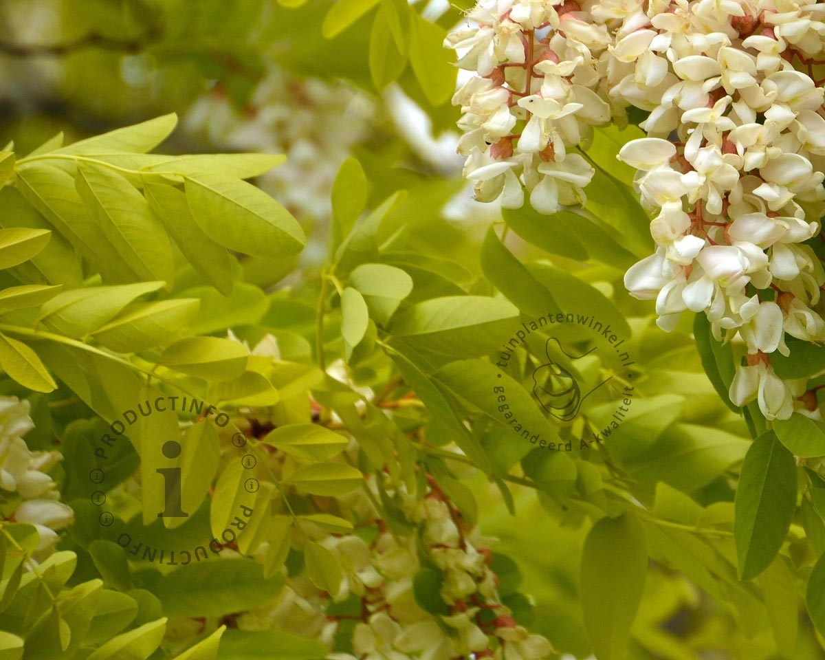Robinia pseudo-acacia 'Frisia' is de geelbladige variant van de Acacia. Een Robinia is een boom met een open kroon en een grijsgroene schors met diepe groeven. Met de gele bladeren komt het zonlicht mooi gefilterd door deze open kroon. De Valse acacia bloeit in juni soms met witte bloemen, die uitgroeien tot vruchten. Op de takken staan scherpe doorns.