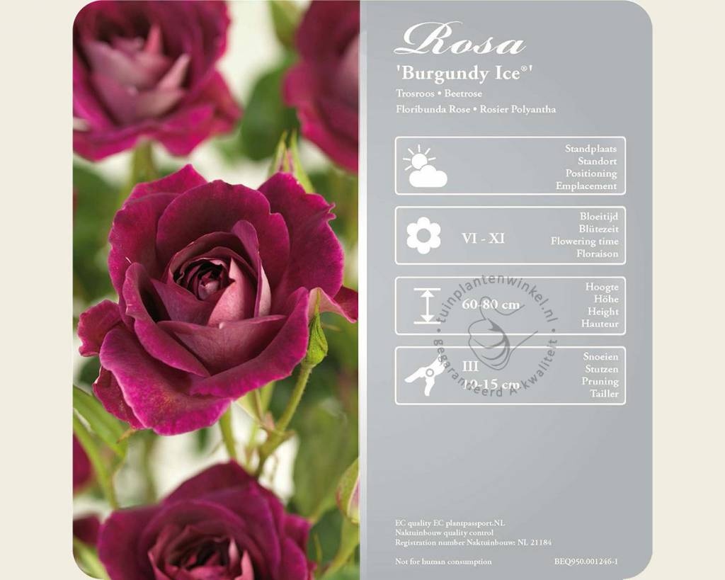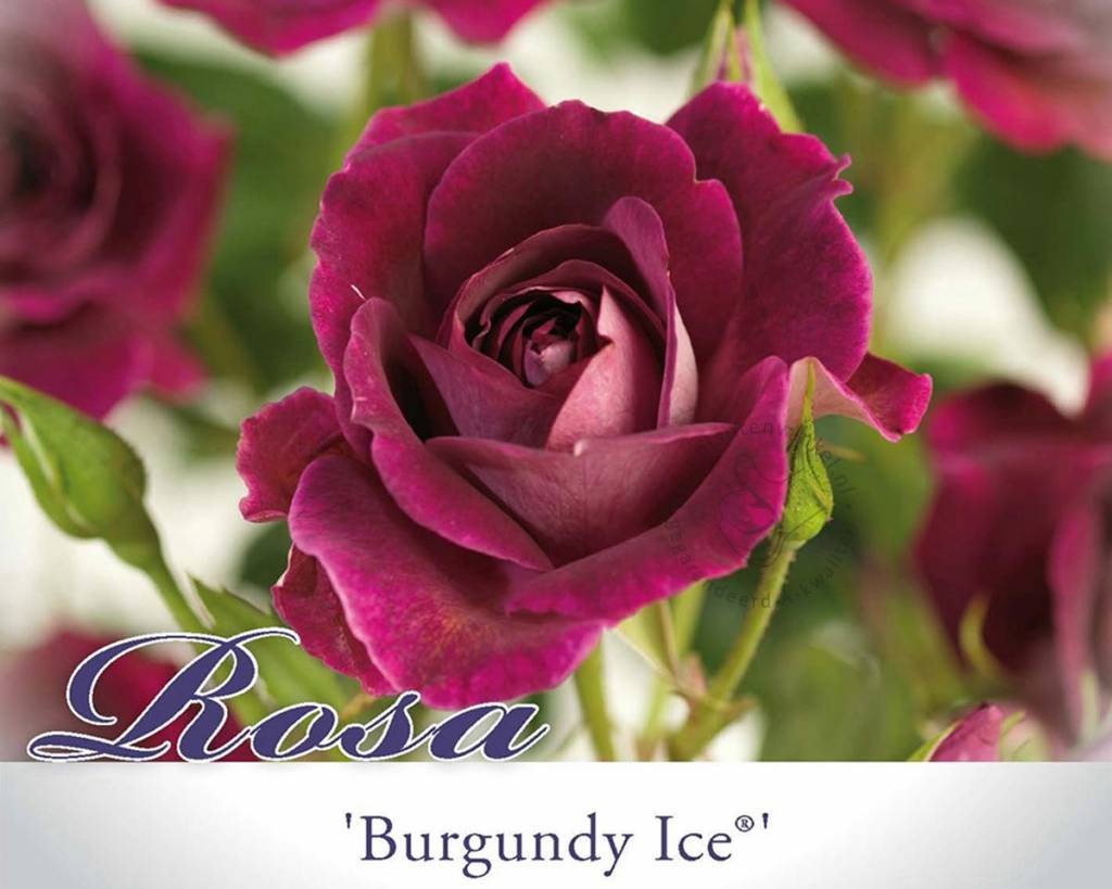 De Rosa 'Burgundy Ice is een vrij nieuwe trosroos. Maar als je als voorouder de Rosa 'Schneewittchen' hebt en in dezelfde eigenschappen mag delen ben je gezegend. Deze 'Burgundy Ice' zou wel eens tot een populaire roos kunnen uitgroeien. De bloemkleur is ongekend. Zelfs de meeldraden van deze halfgevulde trosroos hebben een diep bordeauxrode kleur. De buitenzijde van de bloemblaadjes lijkt wel bepoederd zodat die erg mooi contrasteert met de binnenzijde. Doorbloeiend en bossig groeiend net als haar voorouder. De struikroos 'Burgundy Ice' is een gezonde rozensoort uit de selectie van de veredelaar Fryer (Fryerroos / Fryerrozen). Net als de 'Schneewittchen' is dit een bijna doornloze roos. Deze struikroos groeit uit tot ongeveer 80 centimeter hoogte. Snoei deze roos in het voorjaar terug tot 15 centimeter hoogte.