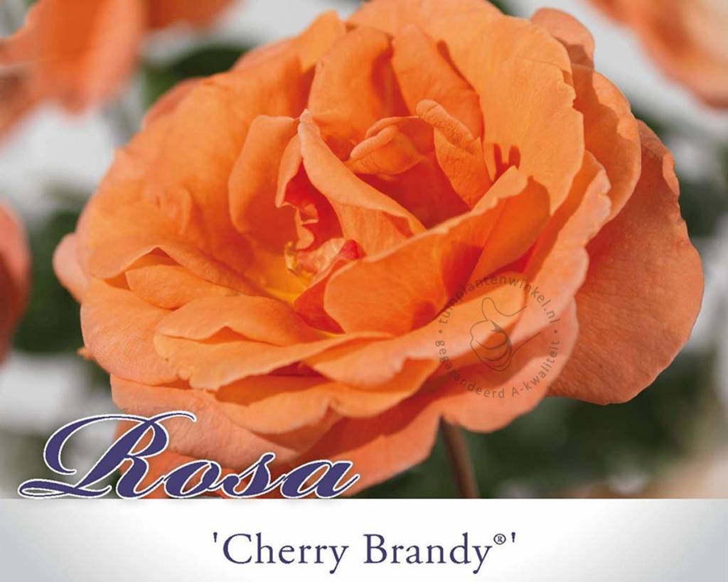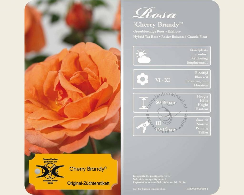 De Rosa 'Cherry Brandy' is een heerlijk geurende grootbloemige struikroos. Ze is een selectie van de veredelaar Tantau (D). De 'Cherry Brandy' bloeit met zalmoranje rozen. Het nieuwe blad heeft een bronze gloed die prachtig combineert met de kleur van de roos. Aan de stevige stelen verschijnen één tot drie rozen. De rosa 'Cherry Brandy' groeit uit tot een struik van ongeveer 80 centimeter. Het beste snoeit u deze rozenstruik in maart tot ongeveer 15 centimeter terug. Geef in het voorjaar voeding zodat de roos krachtig uitloopt. De bloei is dan op zijn mooist. De roos behoort tot de zogenaamde theehybride / theehybriden rozen.