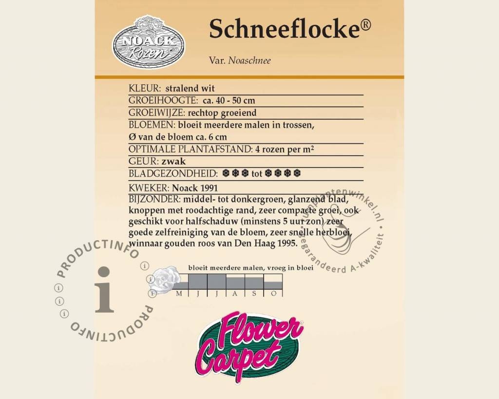 Rosa Flower Carpet 'Schneeflocke' is een gezonde, sterke trosroos. De tuinplant is ziekteresistent, kan tegen hitte en zout; hoeft niet bespoten te worden. Rozen uit de Rosa Flower Carpet serie zijn daarom heel goed toe te passen in openbare ruimtes als vakbeplanting. In uw tuin vult de Roos de border mooi in en als kuipplant op het balkon of het terras is het ook een aanrader. Rosa Flower Carpet 'Schneeflocke' bloeit zeer lang met witte trosrozen. Vlinders, hommels en bijen komen op het stuifmeel af.