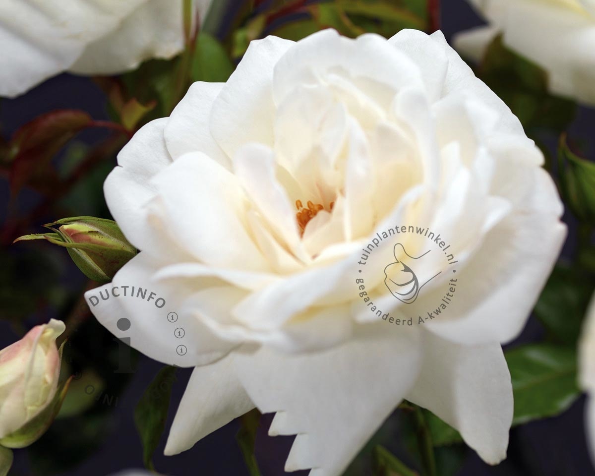 Deze Roos kan met heel veel planten worden gecombineerd, zeker omdat de witte kleur makkelijk is. U kunt kiezen voor vaste planten zoals bijvoorbeeld Lavandula, Anemone, Gaura en Geranium. Maar ook met de heesters zoals Ceratostigma en Hortensia's. Deze grootbloemige roos heeft heel mooi donkergroen glanzend blad.