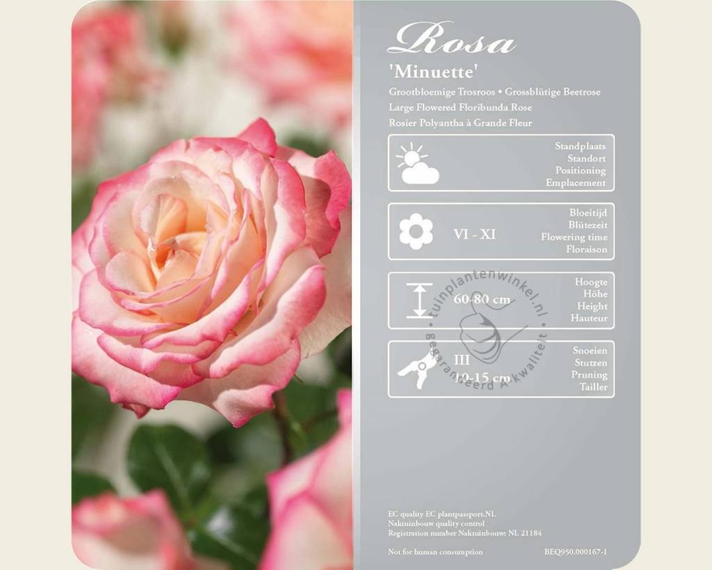 Er zijn altijd een paar rozen die extra hun best doen op te vallen. Deze Rosa 'Minuette' doet dat door in feite met twee kleuren te bloeien. Rosa 'Minuette' combineert een grotendeels witte bloemkleur met een subtiele roze rand. De rozen verschijnen aan stevige opgaande stelen. Combineer deze roos dus gerust met lagere vaste planten. Deze roos groeit uit tot ongeveer 80 centimeter. Rosa 'Minuette' is een sterke rozensoort die wel iets gevoelig is voor sterroetdauw later in de zomer. Hierdoor kan het blad al wat eerder van de plant vallen. In maart knipt u de roos het beste terug en geeft u wat mest. De roos loopt dan weer gewoon gezond uit.