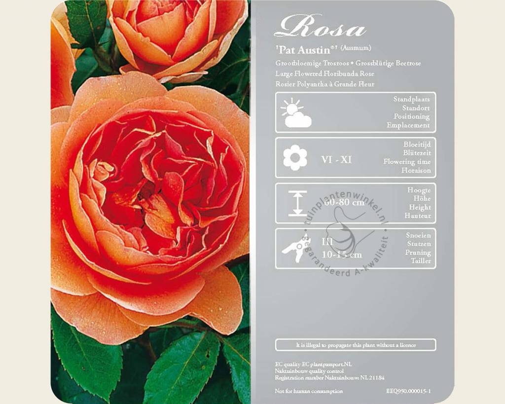 De bijzondere bloemkleur van deze Engelse Rosa 'Pat Austin' is meteen opvallend. De koperoranje gekleurde bloemen zijn half gevuld waarbij de bloemblaadjes heerlijk los over elkaar heen vallen. De rozen verspreiden een heerlijke theegeur met warme tinten. De Rosa 'Pat Austin' is wat ons betreft een aanrader voor iedereen die van geurende rozen houdt. Het blad is glanzend en diepgroen van kleur. 'Pat Austin' heeft een bossige en sterk vertakkende groei wat resulteert in veel bloemen. Rosa 'Pat Austin' bloeit vanaf juni tot aan oktober. De roos kan zowel als struikroos en kleine klimroos worden gebruikt. Combineert ook prachtig met de paarse bloemen van een lavendel. Snoei deze plant als struikroos in maart terug tot ongeveer 15 centimeter hoogte. Bij gebruik als klimroos snoeit u alleen de toppen licht terug. Een synoniem voor deze roos is Rosa 'Ausmum' (David Austinroos / David Austinrozen).