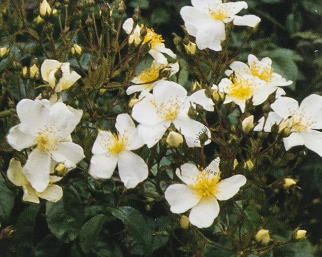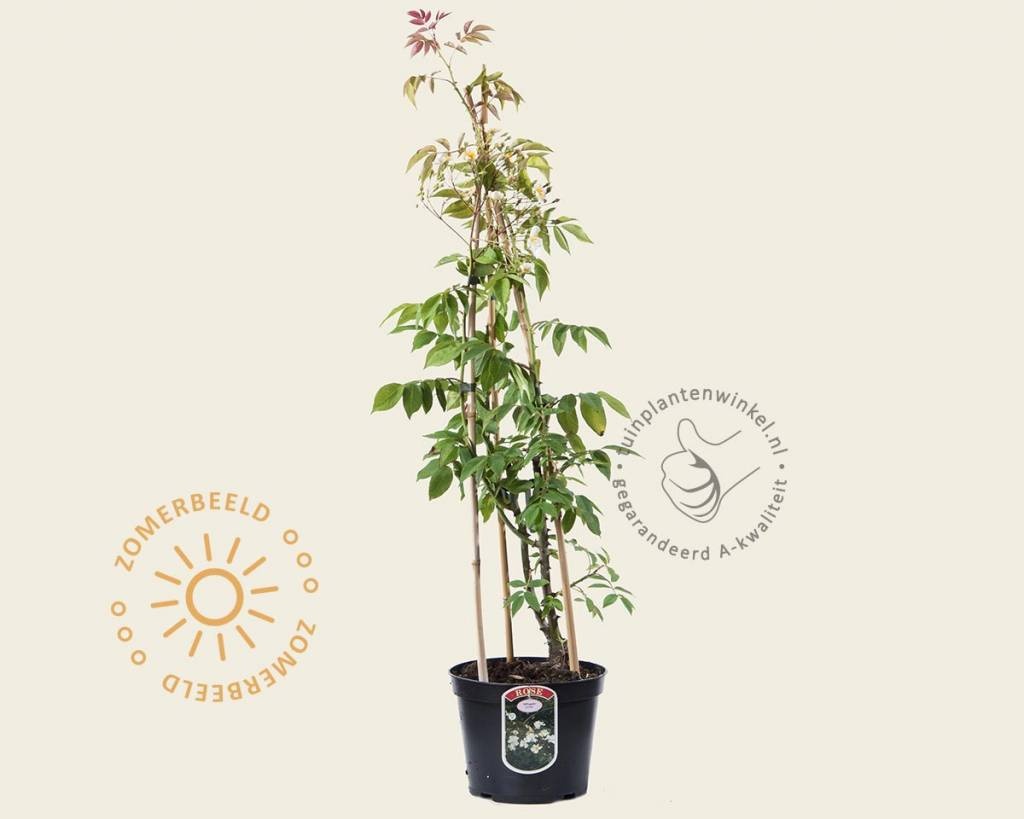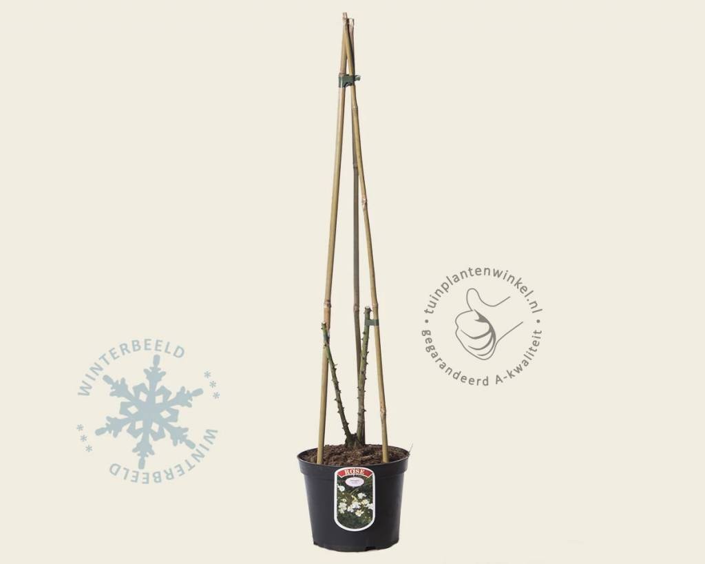 Rosa rambler 'Kiftsgate' is een bladverliezende tuinplant. De rambler roos bloeit eenmalig, maar dat wil zeker niet zeggen dat ze niet de moeite waard is. De roos bloeit in juni met honderden, zo niet duizenden, fraaie bloemen die bovendien een heerlijke geur verspreiden. De nectar van de Botanische klimroos is een ware trekpleister voor bijen. De kleur van de rozen is crème wit en daarnaast vallen de goudgele meeldraden op.