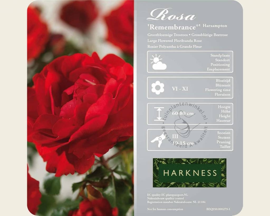 De Rosa 'Remembrance' is een opvallend oranjerood gekleurde trosroos met een compacte groei. De bloemen staan in stevige bossen bij elkaar. Deze roos is nauwelijks geurend maar maakt deze gebrekkigheid meer dan goed door de hoeveelheid bloemen. Daarnaast is deze variëteit gezond en dus goed bestand tegen ziektes. De Rosa 'Remembrance' is een selectie van de veredelaar Harkness (Harknessroos / Harknessrozen). Deze trosroos wordt ongeveer 80 centimeter hoog. Knip de oude bloemen terug gedurende de zomer voor een langere bloei.