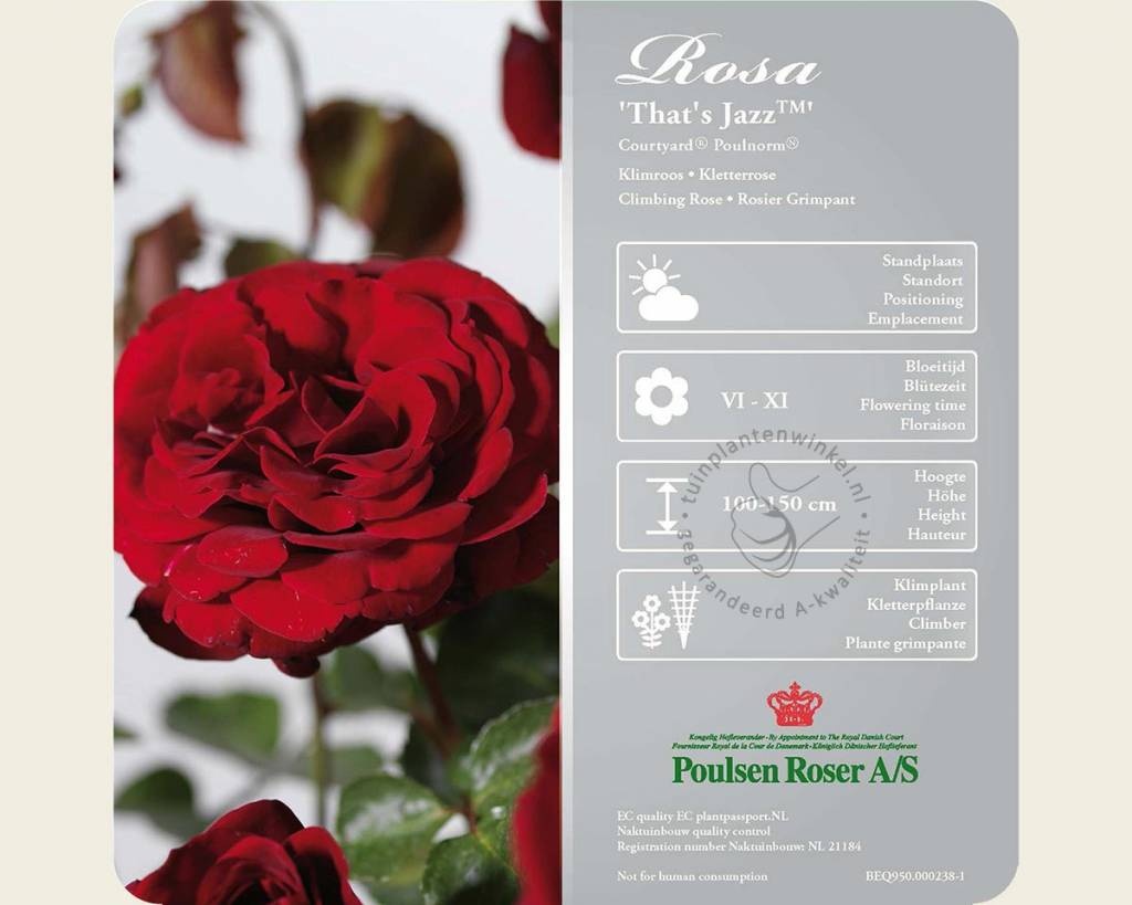 De Rosa 'That's Jazz' is een van de nieuwste en volgens ons beste rode klimrozen. Ze valt op met grote sterk gevulde en geurende rozen. Het blad van deze klimroos loopt rood uit en verkleurt daarna diep glanzend groen. De groei is sterk en betrouwbaar, zowel in de hoogte als in de breedte. De Rosa 'That's Jazz' is doorbloeiend; de bloei duurt van juni tot aan oktober. De rozen staan alleen of in kleine bundels aan vrij stevige takken. De uiteindelijke hoogte van deze klimroos bedraagt ongeveer anderhalve tot tweeëneenhalve meter. De klimroos 'That's Jazz' is een selectie van de veredelaar Poulsen (Poulsenroos / Poulsenrozen). Deze rozensoort wordt ook onder de naam Rosa 'Naheglut' aangeboden.