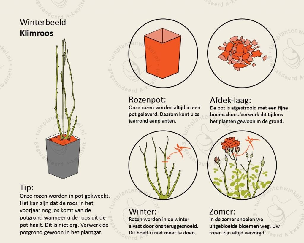 Onderhoud van klimrozen vergt een andere aanpak dan bij de andere rozenplanten. Het is niet moeilijk. Iedereen kan elk jaar weer genieten van mooie gezonde planten die de hele zomer de meest prachtige bloemen geven. Om u hierbij te helpen, hebben we op Tuinplantenwinkel.nl een artikel geschreven met tips over het onderhoud en snoeien van klimrozen. Met behulp van foto's en pictogrammen leggen we het snoeien en onderhoud duidelijk uit. Als u deze tips opvolgt, kunt u jaren genieten van uw nieuwe aanwinst!