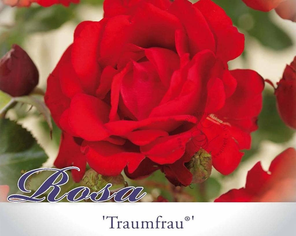 De Rosa 'Traumfrau' is een prachtige rode struikroos met grote stevig gevulde bloemen. De buitenzijde van de bloemen zijn gefranjerd wat de roos onderscheidt van bijvoorbeeld de Rosa 'Dame de Coeur'. De bloemen verschijnen alleenstaand of in kleine groepen bovenaan stevige stelen. Deze struikroos groeit bossig en wordt ongeveer 80 centimeter hoog. De 'Traumfrau' is een doorbloeiende struikroos; ze bloeit van juni tot aan oktober. Zet deze roos in de zon of halfschaduw. Het blad is gezond en heeft weinig last van rozenziektes. Snoei deze struikroos in maart terug tot een hoogte van ongeveer 15 centimeter. De Rosa 'Traumfrau' is een selectie van de veredelaar Kordes (Kordesroos / Kordesrozen). De roos behoort tot de Eleganza-serie. Deze roos is een zogenaamde theehybride roos / theehybriden rozen.