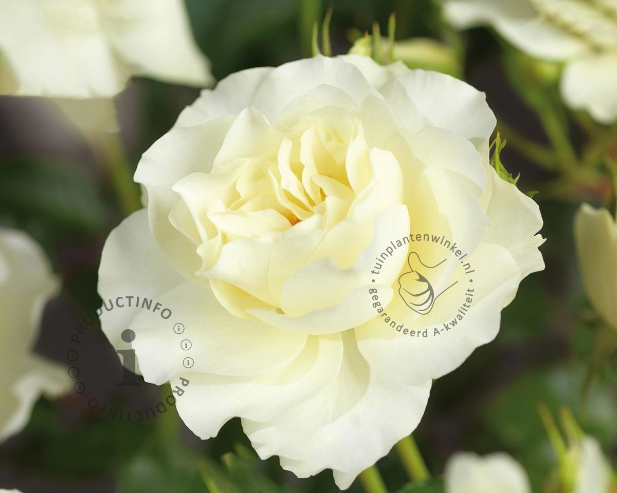 De naam van deze Rosa 'White Meilove' klopt eigenlijk niet helemaal. De roos is namelijk niet spierwit maar heeft een crème-gele tot witte kleur. We hebben gemerkt dat de exacte kleur afhankelijk is van het weer. Niettemin is het een erg fraaie roos met gevulde bloemen. De bloembladeren staan in een kom bijeen. De Rosa 'White Meilove' is een doorbloeiende rozensoort: de bloei duurt van juni tot aan oktober. De groei is opgaand en goed bossig. Snoei de stamroos in maart terug tot een hoogte van ongeveer 15 centimeter vanaf de entplaats. De Rosa 'White Meilove' is een selectie van de veredelaar Meilland. Een synoniem voor deze roos is de Rosa 'Inner Wheel' en Rosa 'Meifarigou'.